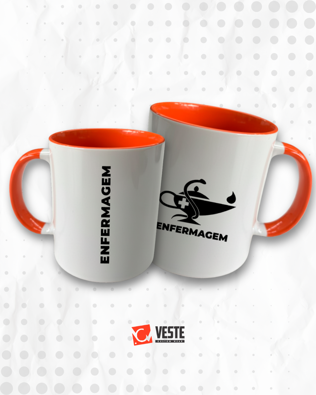 Caneca de Enfermagem, cerâmica branca com interior laranja, com estampa do logo e nome do curso na frente e nome do curso atrás, é perfeita para usar na faculdade, no escritório ou presentear alguém da área de enfermagem. Durável, elegante e com o acabamento impecável da Veste CW, essa caneca é o item ideal para representar seu curso com orgulho!