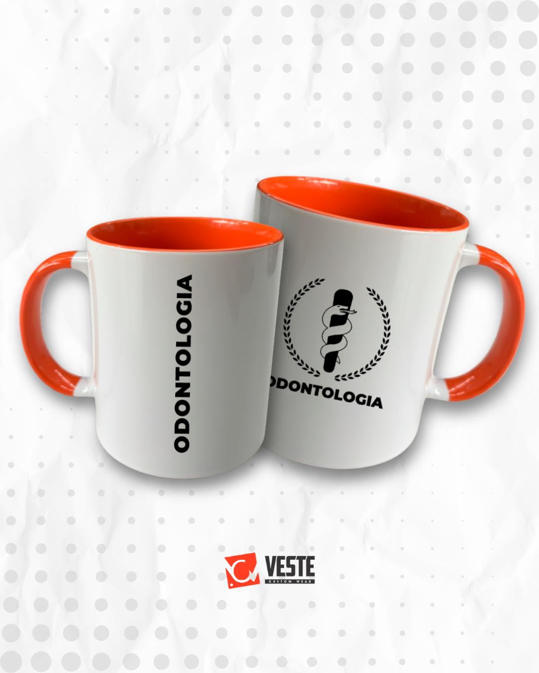 Caneca de Odontologia, cerâmica branca com interior laranja, com estampa do logo e nome do curso na frente e nome do curso atrás, é perfeita para usar na faculdade, no escritório ou presentear alguém da área de odontologia. Durável, elegante e com o acabamento impecável da Veste CW, essa caneca é o item ideal para representar seu curso com orgulho!