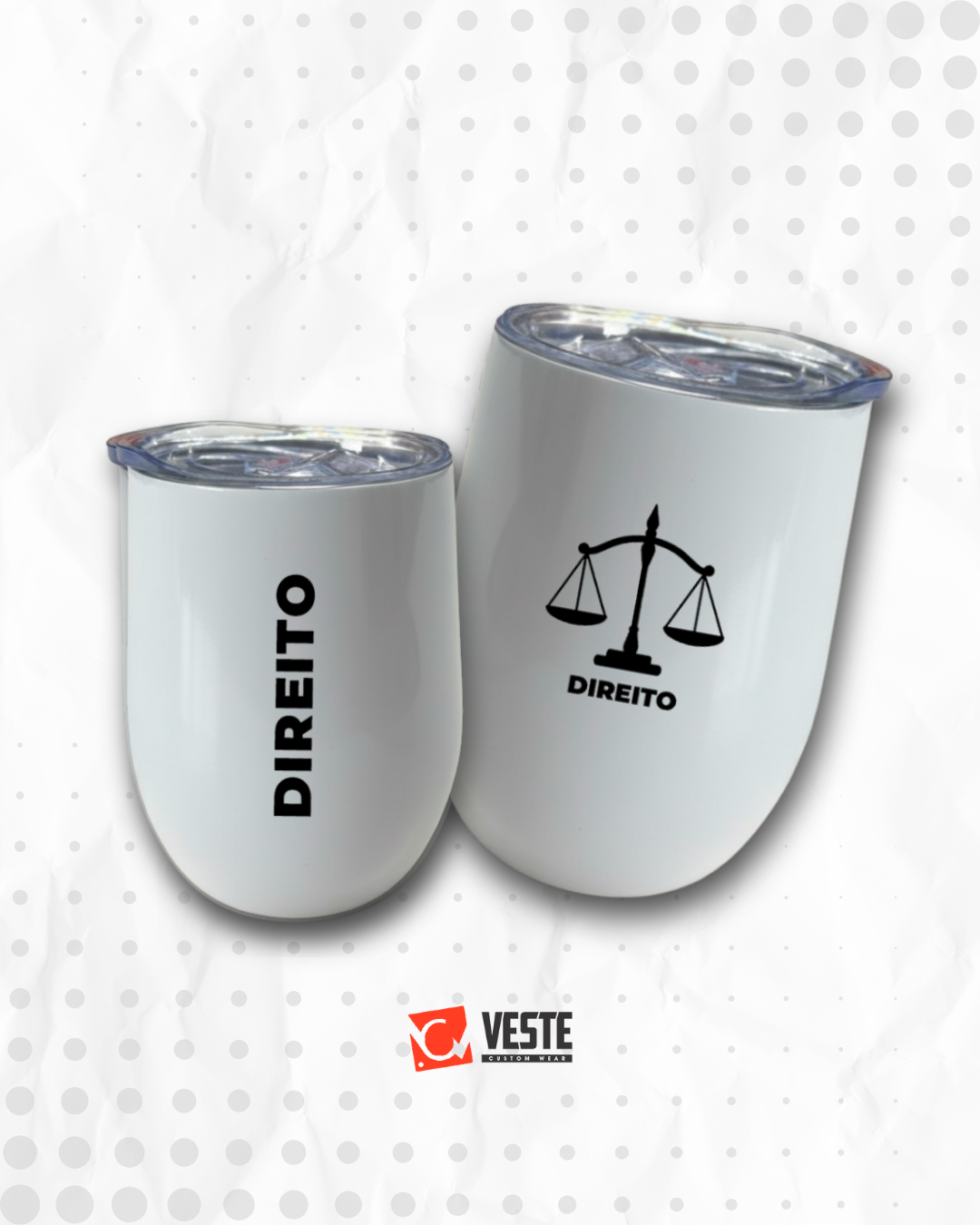 Copo térmico de inox, branco, com parede dupla e tampa, capacidade de 350ml. Para estudantes de Direito que querem manter suas bebidas quentes ou frias por mais tempo. Com estampa do logo e nome do curso na frente e nome do curso atrás, é ideal para usar na faculdade, nos estudos ou no trabalho. Compacto, resistente e modern, o copo térmico que representa seu curso praticidade e orgulho.