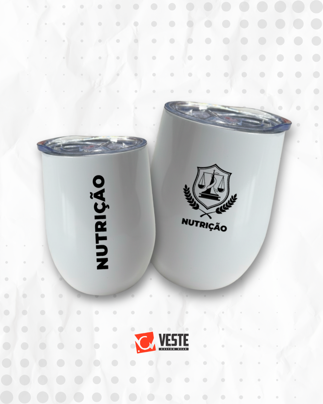 Copo térmico de inox, branco, com parede dupla e tampa, capacidade de 350ml. Para estudantes de Nutrição que querem manter suas bebidas quentes ou frias por mais tempo. Com estampa do logo e nome do curso na frente e nome do curso atrás, é ideal para usar na faculdade, nos estudos ou no trabalho. Compacto, resistente e moderno, o copo térmico que representa seu curso praticidade e orgulho.