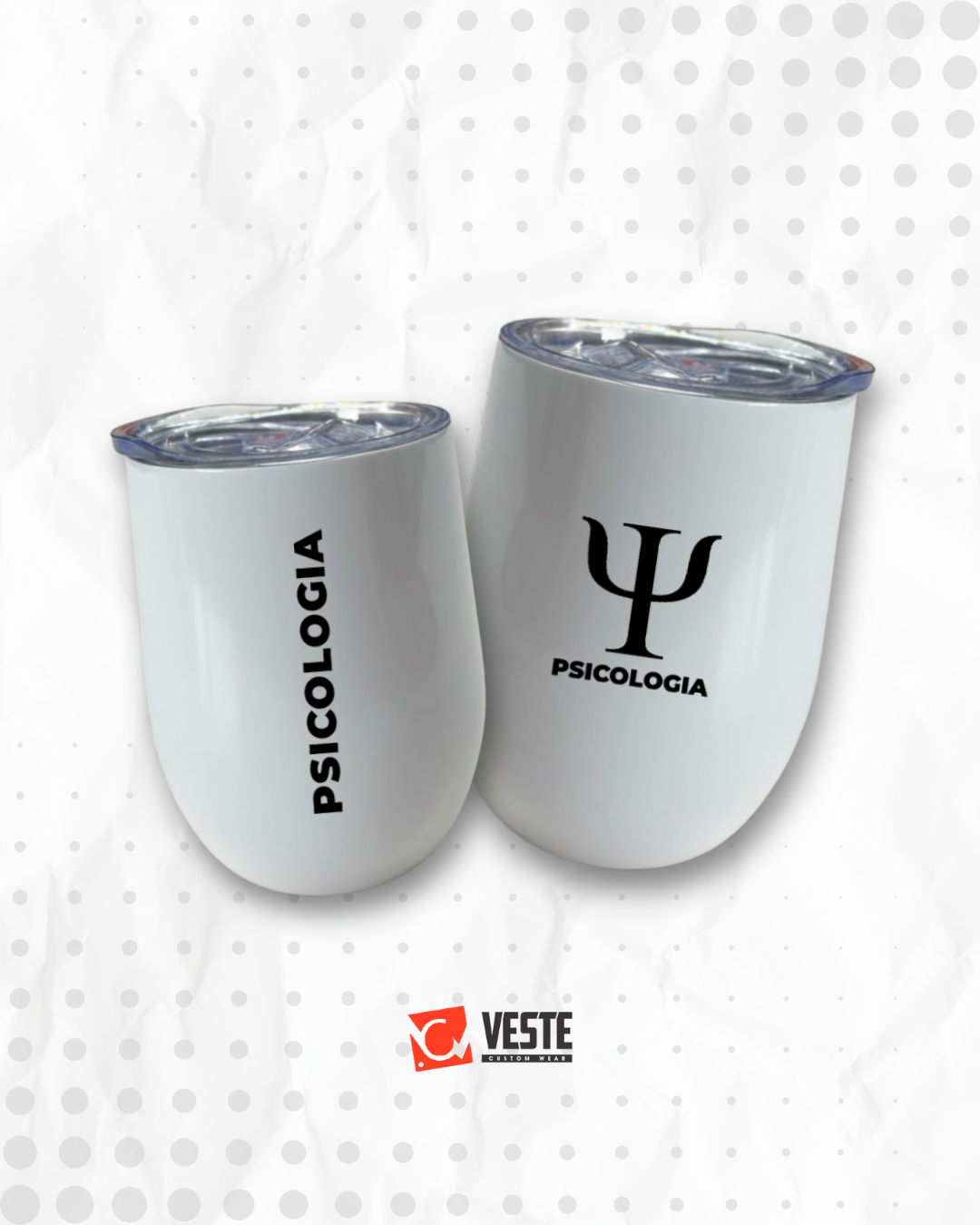 Copo térmico de inox, branco, com parede dupla e tampa, capacidade de 350ml. Para estudantes de Psicologia que querem manter suas bebidas quentes ou frias por mais tempo. Com estampa do logo e nome do curso na frente e nome do curso atrás, é ideal para usar na faculdade, nos estudos ou no trabalho. Compacto, resistente e modern, o copo térmico que representa seu curso praticidade e orgulho.