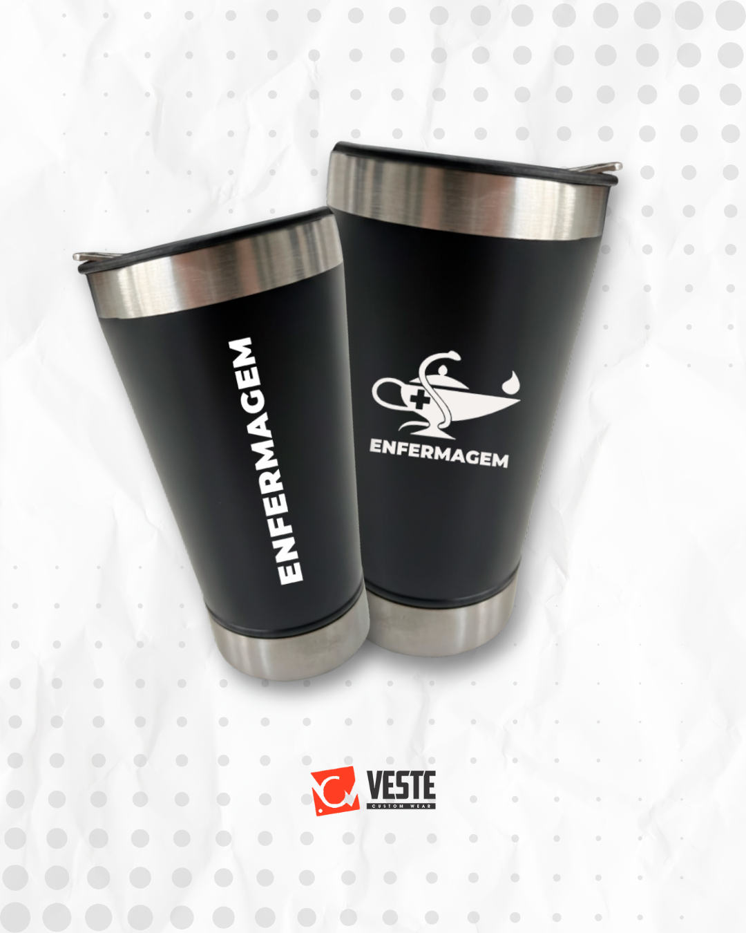 Copo térmico Special Light de inox, preto, com tampa e capacidade de 500ml. Com estampa do logo e nome do curso na frente e nome do curso atrás, mantém sua bebida quente ou fria por mais tempo. Prático e resistente é perfeito para o dia a dia da faculdade e para mostrar orgulho pelo curso de Enfermagem.