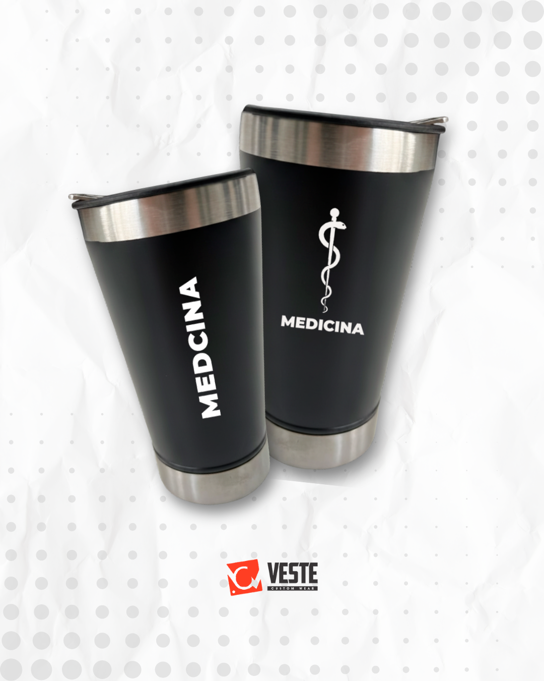Copo térmico Special Light de inox, preto, com tampa e capacidade de 500ml. Com estampa do logo e nome do curso na frente e nome do curso atrás, mantém sua bebida quente ou fria por mais tempo. Prático e resistente é perfeito para o dia a dia da faculdade e para mostrar orgulho pelo curso de Medicina.