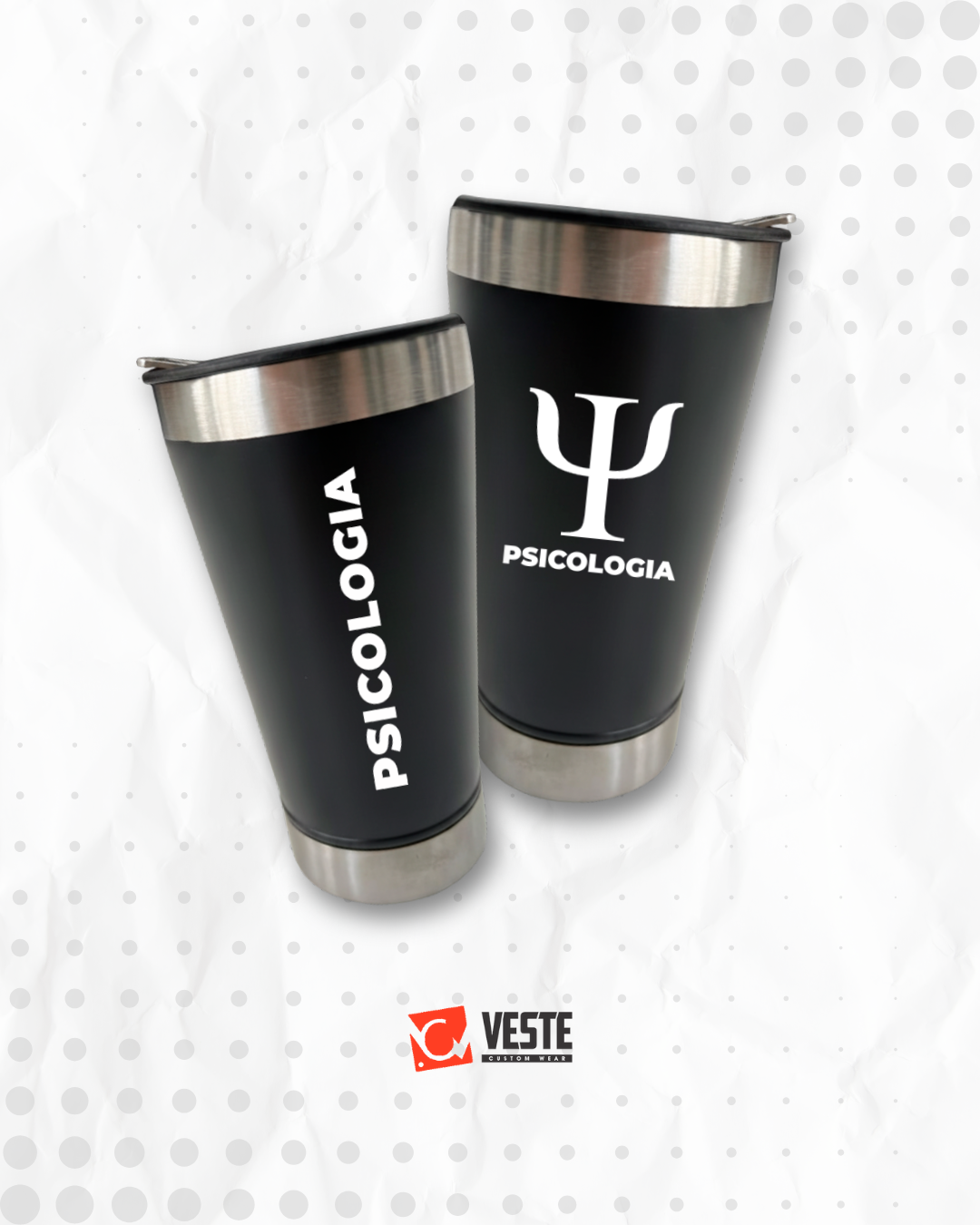 Copo térmico Special Light de inox, preto, com tampa e capacidade de 500ml. Com estampa do logo e nome do curso na frente e nome do curso atrás, mantém sua bebida quente ou fria por mais tempo. Prático e resistente é perfeito para o dia a dia da faculdade e para mostrar orgulho pelo curso de Psicologia.