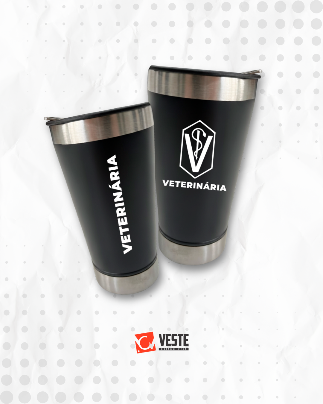 Copo térmico Special Light de inox, preto, com tampa e capacidade de 500ml. Com estampa do logo e nome do curso na frente e nome do curso atrás, mantém sua bebida quente ou fria por mais tempo. Prático e resistente é perfeito para o dia a dia da faculdade e para mostrar orgulho pelo curso de Veterinária.
