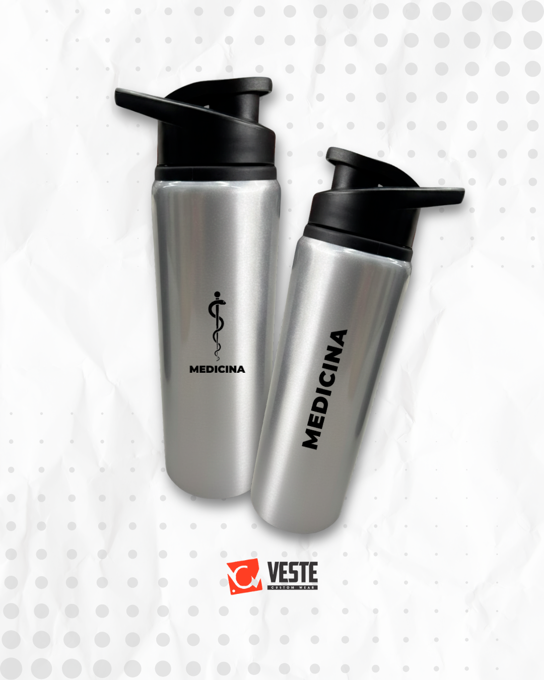Garrafa squeeze de alumínio prata com capacidade de 750ml, ideal para estudantes que querem manter suas bebidas na temperatura certa durante aulas, estágios ou estudos e ainda mostrar orgulho pelo curso de Medicina. Com estampa do logo e nome do curso na frente e nome do curso atrás, é prática, resistente e perfeita para o dia a dia da faculdade.