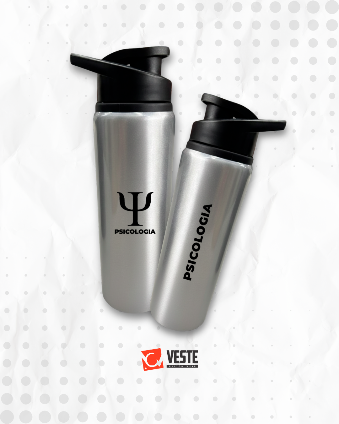 Garrafa squeeze de alumínio prata com capacidade de 750ml, ideal para estudantes que querem manter suas bebidas na temperatura certa durante aulas, estágios ou estudos e ainda mostrar orgulho pelo curso de Psicologia. Com estampa do logo e nome do curso na frente e nome do curso atrás, é prática, resistente e perfeita para o dia a dia da faculdade.
