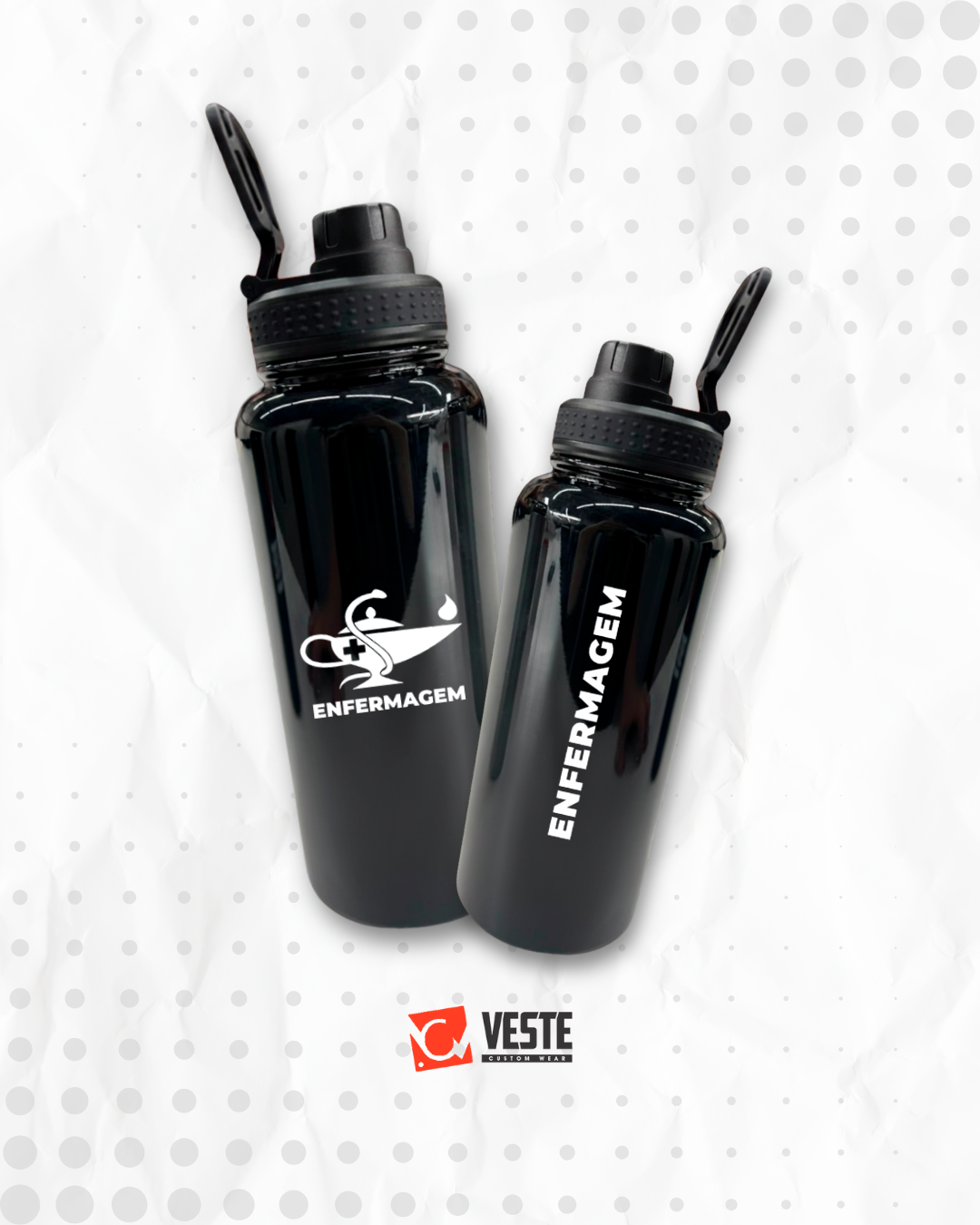Garrafa squeeze térmica preta de 900ml com tampa emborrachada do curso de Enfermagem. Com estampa do logo e nome do curso na frente e nome do curso atrás, mantém sua bebida quente ou fria por mais tempo. Resistente e prática, é ideal para o dia a dia da faculdade e para mostrar orgulho pelo seu curso.