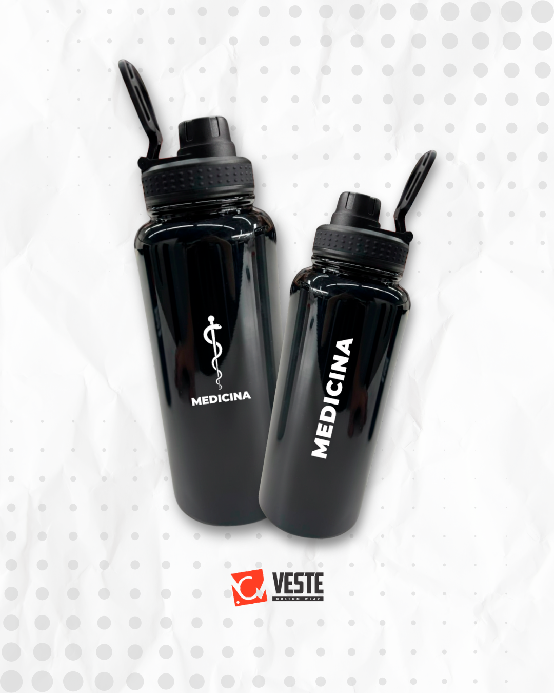 Garrafa squeeze térmica preta de 900ml com tampa emborrachada do curso de Medicina. Com estampa do logo e nome do curso na frente e nome do curso atrás, mantém sua bebida quente ou fria por mais tempo. Resistente e prática, é ideal para o dia a dia da faculdade e para mostrar orgulho pelo seu curso.