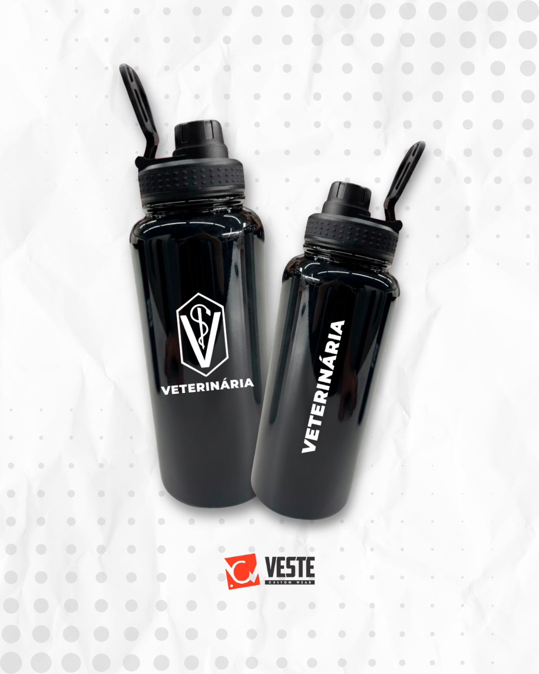 Garrafa squeeze térmica preta de 900ml com tampa emborrachada do curso de Veterinária. Com estampa do logo e nome do curso na frente e nome do curso atrás, mantém sua bebida quente ou fria por mais tempo. Resistente e prática, é ideal para o dia a dia da faculdade e para mostrar orgulho pelo seu curso.