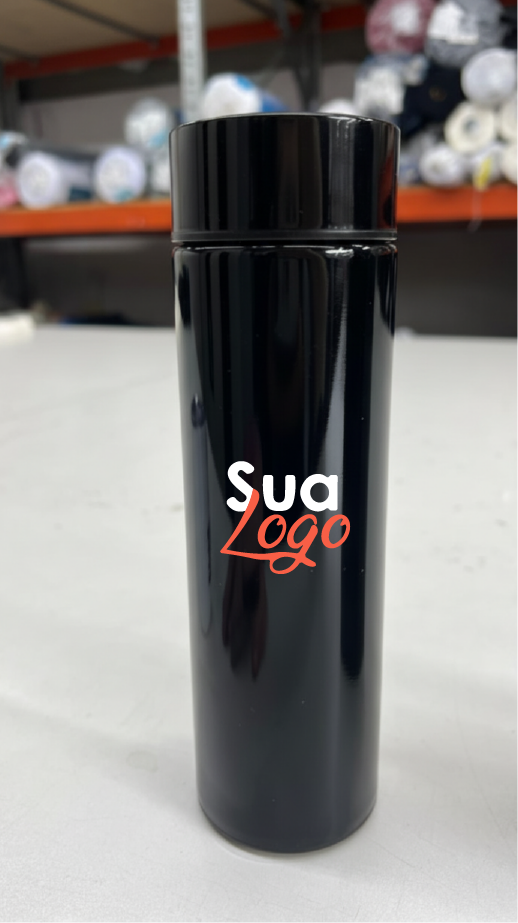 Garrafa térmica personalizável, de inox preta, 400ml com infusor interno, ideal para manter suas bebidas quentes ou geladas por mais tempo. É perfeita para o dia a dia e brindes em empresas e eventos. Resistente, prática e funcional.